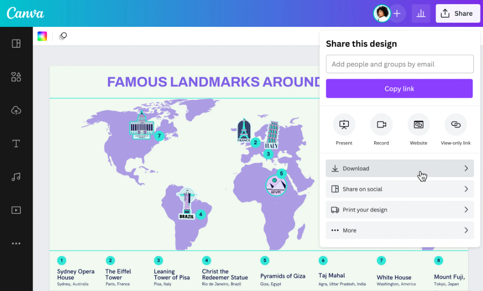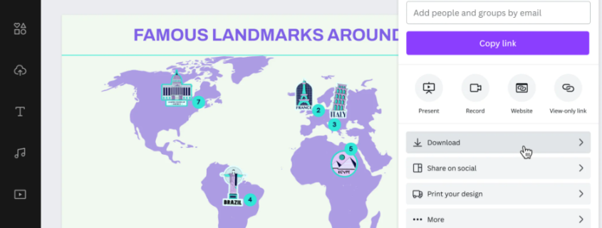 7. Eksplorasi Fitur Animasi: Canva menawarkan fitur animasi yang dapat Anda gunakan untuk membuat peta yang lebih interaktif dan menarik.