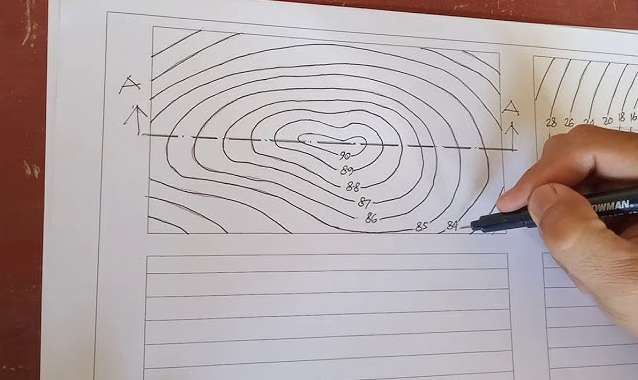 3. Penggambaran Garis Kontur: Mulailah dengan menggambar garis kontur pada peta dasar. Gunakan penggaris untuk menghubungkan titik-titik yang memiliki elevasi sama sesuai interval kontur yang telah ditentukan. Usahakan untuk menggambar garis kontur dengan rapi dan halus.