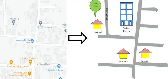 - Petunjuk Arah: Sertakan petunjuk arah ke lokasi dari titik acuan terdekat.