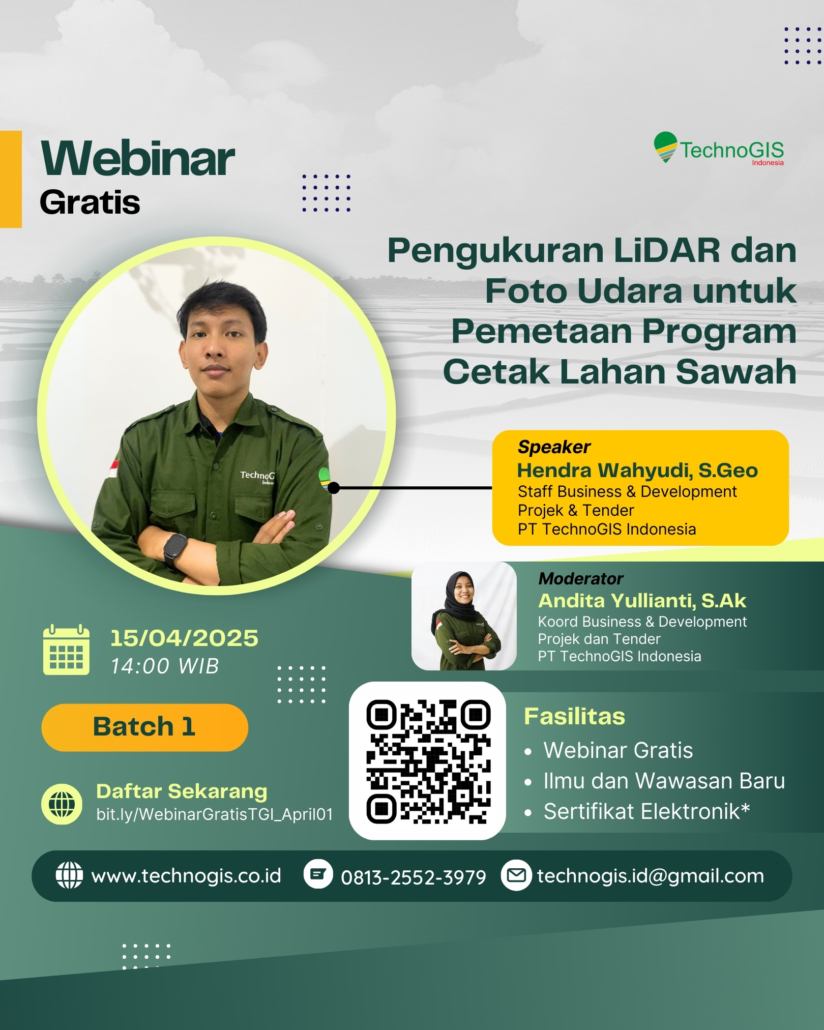Webinar ini akan membahas bagaimana peran teknologi LiDAR dan juga foto udara dalam Program Pemetaan Cetak Lahan Sawah yang saat ini sedang digencarkan oleh pemerintah. Didalamnya akan membahas mengenai apa saja keunggulan juga proses dari akuisisi data di lapangan hingga proses pengolahan datanya sampai menjadi hasil final